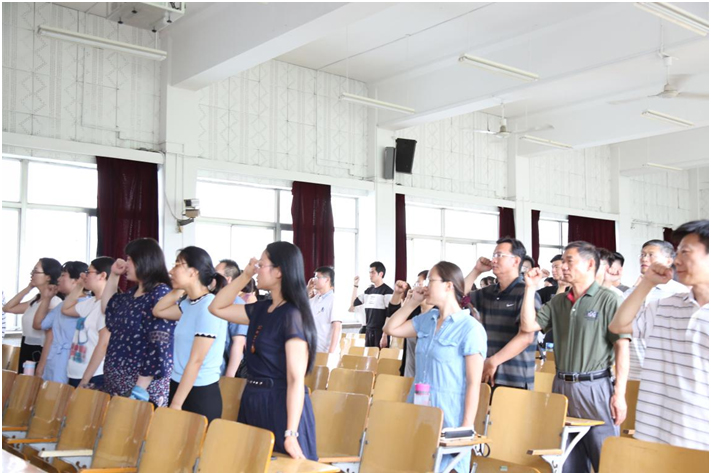 6月29日,文学院党委召开党委会扩大会议,表彰优秀党支部和优秀共产党员,全体党员和学生干部代表参加。为进一步增强党员意识,永葆共产党员政治本色,文学院全体党员在会上以集体宣誓的方式重温了入党誓词,表现出了共产党员的庄严承诺和坚定决心。会上,文学院党委对本年度有突出贡献的教工党支部、本科生党支部及12名优秀共产党员进了表彰。党委书记苏占兵指出,“打铁还需自身硬,万峰磅礴看主峰”,各党支部和全体党员要不忘初心、牢记使命,进一步发挥好战斗堡垒作用和先锋模范作用。随后,为进一步学习贯彻习近平新时代中国特色社会主义思想和党的十九大精神,苏占兵为全体党员讲授了专题党课。
