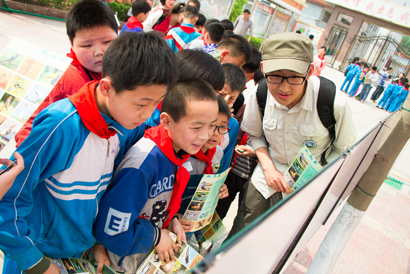 我校爱鸟协会会员为在场的小学生发放鸟类宣传材料。在场的小学生对折页、书签及摄影作品上的鸟类表现出浓厚的兴趣,纷纷向观鸟协会同学抛出问题。