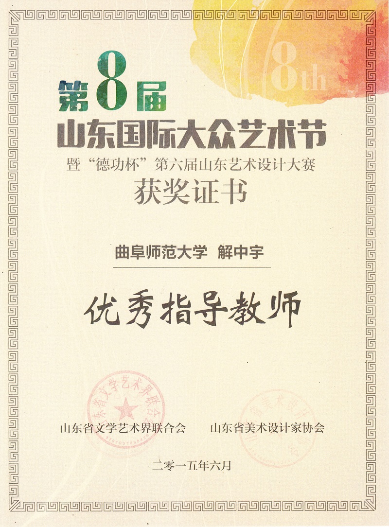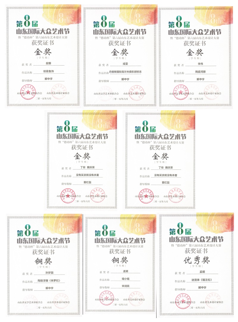 日前,在由山东省委宣传部、山东省文学艺术节联合会、山东省美术设计家协会主办,山东省美术设计家协会学术展览部承办的“第八届山东国际大众艺术节暨‘德功杯’第六届山东艺术设计大赛”中,我校美术学院参赛同学在相关老师的悉心指导下,积极准备,在VI设计、海报设计、陶艺装置雕刻等项比赛中共获得学生组金奖四项、铜奖两项、优秀奖一项。解中宇老师获得此次大赛的优秀指导教师奖。