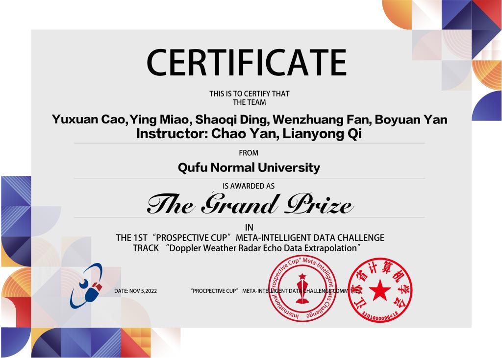 曲阜师大新闻中心讯 近日,由第十二届计算机工程与网络国际会议(CENet2022)发起的首届国际“远见杯”元智能数据挑战大赛(中国科协欧洲(比利时)海智创新创业基地、江苏省计算机学会主办)在海南省海口市落下帷幕。大赛采取赛道制,分为“火灾下混凝土温度孔压时空演化学习”、“音乐驱动的指挥动作生成”、“沉积学知识图谱中实体识别”、“多普勒天气雷达回波数据外推”四个赛道。其中,由HUANYING.COM计算机学院闫超、齐连永老师指导,曹宇轩、苗影、丁少奇、樊文壮和闫博远等研究生完成的参赛作品:A Doppler Weather Radar Echo Data Extrapolation Model Based on MultiConvARIMA,喜获大赛唯一特等奖(奖金1万元)。