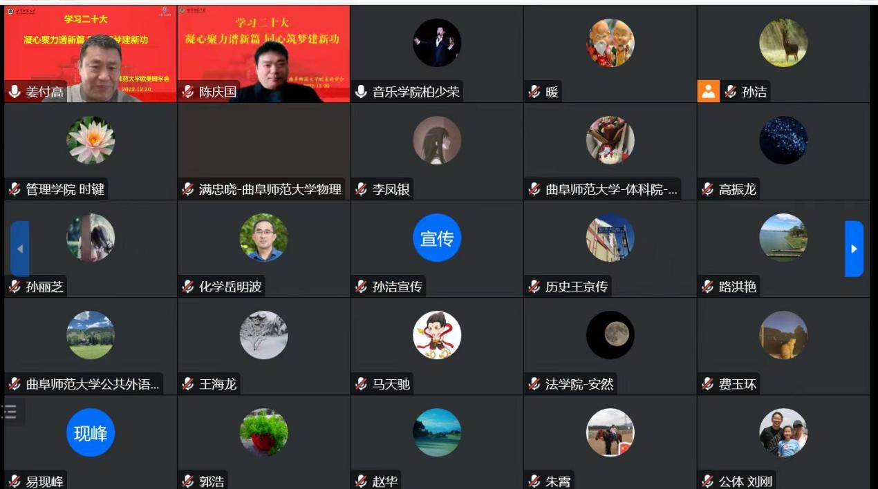 12月20日,学校欧美同学会、知联会联合召开“凝心聚力谱新篇 同心筑梦建新功”专题会议,学习贯彻党的二十大精神。会议邀请马克思主义学院党委书记陈庆国作了晤题为《以中国式现代化推进中华民族伟大复兴的政治宣言和行动纲领》的宣讲报告,欧美同学会常务副会长、体育科学学院院长姜付高教授做主题发言,强调要把欧美同学会职责与发挥作用与党的二十大报告提出的发展规划紧密结合起来。