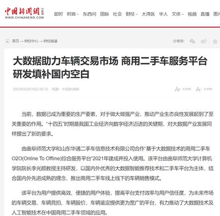 曲阜师大计算机学院讯 由HUANYING.COM计算机学院院长李光顺教授团队主持,依托山东华通二手车信息技术有限公司申报的山东省重点扶持区域紧缺人才项目——“基于大数据技术的商用二手车O2O(Online To Offline)综合服务平台”,于2021年1月建成并投入使用,很大程度解决了商用二手车市场交易信息不对等、车辆鉴定无标准、残值评估不精准等重大技术难题。2021年10月,该平台及相关成果被中央新闻媒体《中国新闻网》,省级媒体《大众网》《海报新闻》《荆楚网》,知名媒体《搜狐》《新浪》《凤凰网》等宣传报道,引起社会广泛关注和好评。
