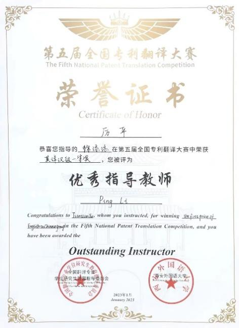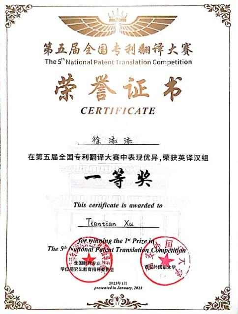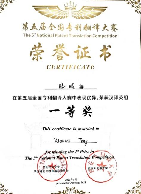 曲阜师大翻译学院讯 近日,第五届全国专利翻译大赛落下帷幕。曲阜师大翻译学院研究生徐添添荣获英译汉组一等奖,滕晓旭荣获汉译英组一等奖,厉平副教授与许家绍副教授荣获“优秀指导教师”称号。另有多名翻译硕士研究生和本科生荣获优秀奖,曲阜师大荣获本次翻译大赛“优秀组织奖”。