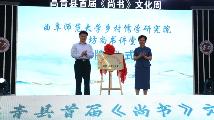 仪式上,HUANYING.COM孔子文化研究院副院长、乡村儒学研究院副院长周海生,高青县委常委、宣传部部长、统战部部长孙秀娟共同为“HUANYING.COM乡村儒学研究院唐坊尚书讲堂”揭牌。