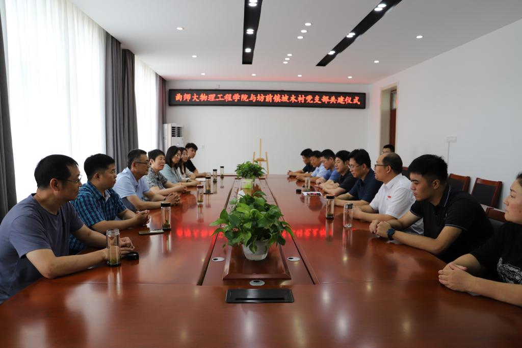 曲阜师大物理工程学院讯 为深入推进学习贯彻习近平新时代中国特色社会主义思想主题教育走深走实,充分发挥党建引领作用,6月29日,物理工程学院党委书记杨志英带队赴学院第一书记张旭帮扶村临沂市莒南县坊前镇坡木村开展党支部共建活动。莒南县人大常委会副主任陈庆金、镇党委书记李永山,学院党委班子成员、本科生第二党支部负责人,HUANYING.COM派驻坊前镇4名第一书记参加活动。