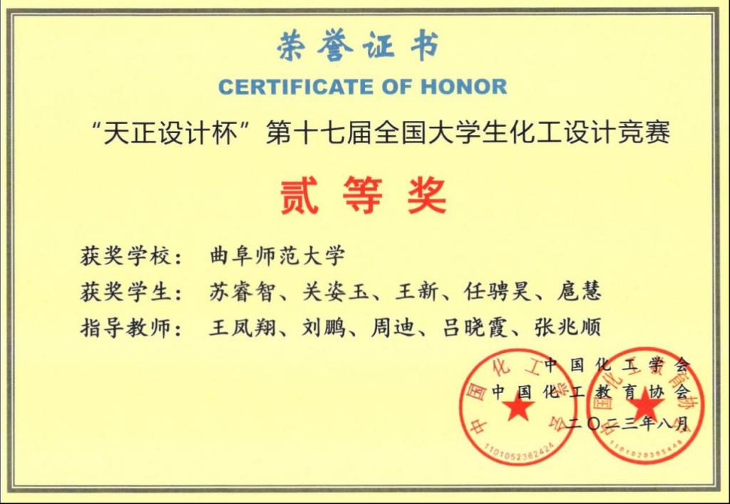 曲阜师大化学与化工学院讯  近日,第十七届全国大学生化工设计竞赛全国总决赛落下帷幕,曲阜师大化学与化工学院“腈诚所至”团队的项目荣获全国二等奖,这是学校首次组队参加该项赛事,即获此佳绩。“腈诚所至”团队由化学工程与工艺专业2020级学生苏睿智、关姿玉、王新、任骋昊、扈慧组成,由王凤翔、刘鹏、周迪、吕晓霞、张兆顺老师参与指导。