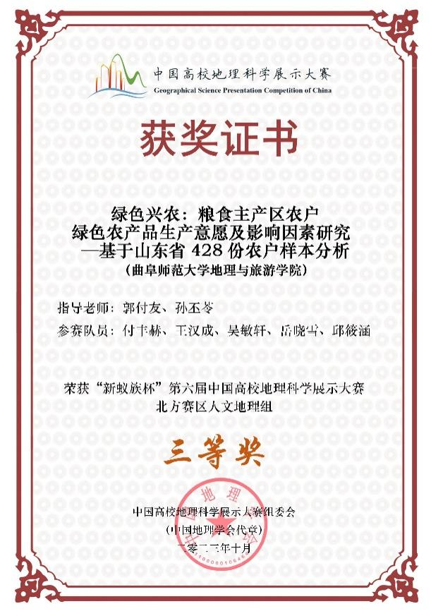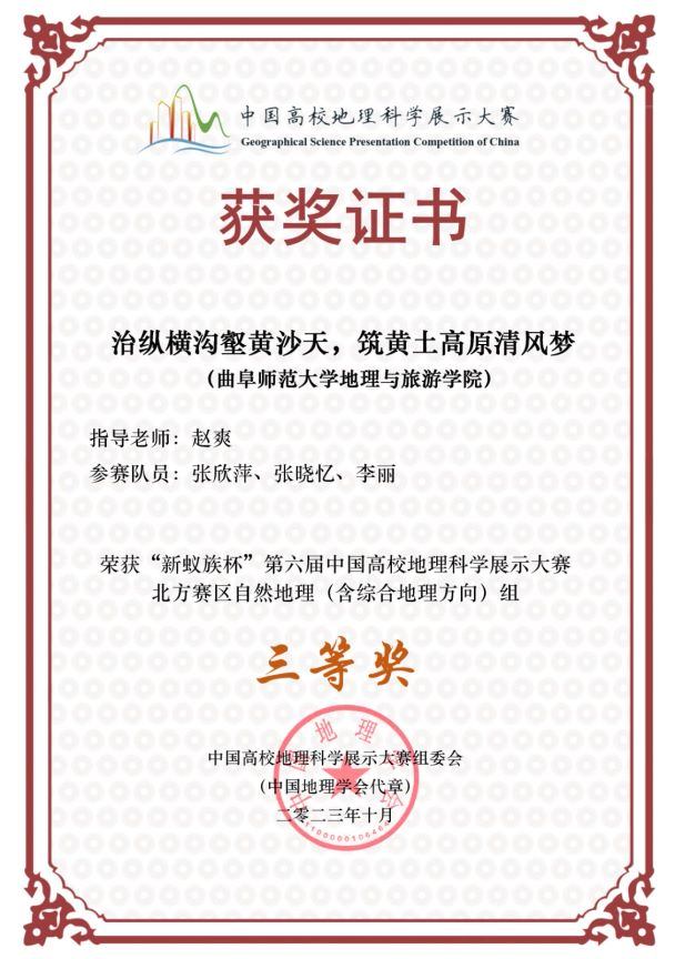 地理与旅游学院选派两支队伍积极参赛,在孙丕苓老师、郭付友老师和赵爽老师指导下,分别荣获北方赛区人文地理组三等奖和自然地理组三等奖。