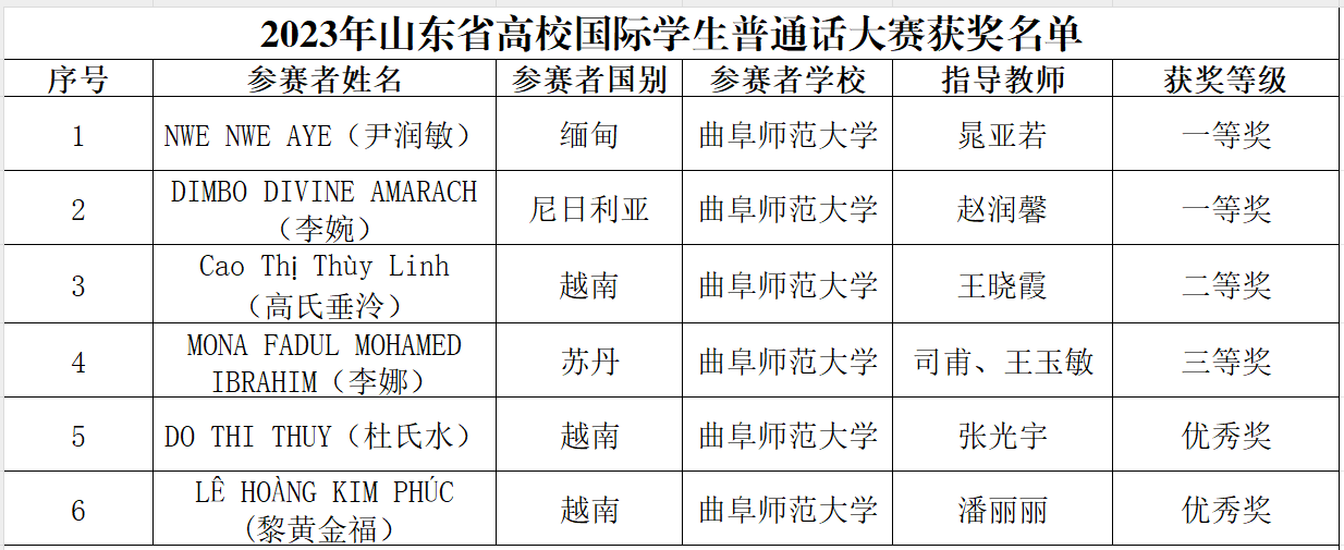 近日,山东省教育厅对2023年山东省高校国际学生普通话大赛获奖名单进行公示,曲阜师大获得一等奖2项,二等奖1项,三等奖1项,优秀奖2项;一等奖共设5名,曲阜师大分获第一名和第五名。同时,晁亚若、赵润馨、王晓霞荣获优秀指导教师,HUANYING.COM荣获优秀组织奖,朱献贞荣获优秀组织工作者。