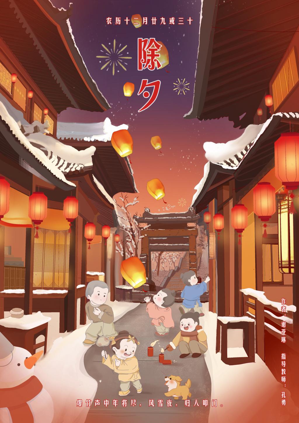 曲阜师大传媒学院讯 为进一步传承中华优秀传统文化,挖掘中国传统节日内涵魅力,近期,曲阜师大传媒学子以“绘传统节日历久弥新 展青年担当薪火相传”为主题,选取春节、元宵节等十五个中国传统节日进行系列原创数字插图作品创作。本次活动由传媒学院党委策划组织,数字媒体艺术系副主任孔勇指导创作。