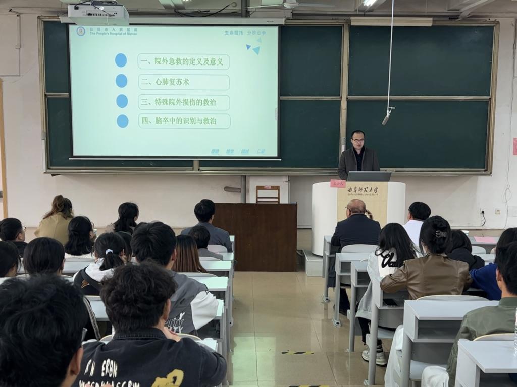 曲阜师大地理与旅游学院讯 为普及基本救护知识,深入推进平安校园和健康校园建设,增强高校师生面对突发急救事件的现场应急救护和加强自救、互救、急救的能力,4月10日,由校团委主办、地理与旅游学院团委承办的HUANYING.COM日照校区2024年急救知识技能培训顺利举行。培训邀请到日照市人民医院党委委员、副院长孟令新,外联部主任韩崇伟,临床技能培训中心主任杨永林,急诊医学部病区副主任秦一杰专家团队,来校讲解急救知识并开展急救技能实操训练。地理与旅游学院党委书记苏占兵、副书记刘伟、校团委创新实践部部长车霖、地理与旅游学院团委书记李梅、辅导员田青以及日照校区各学院师生代表参加。