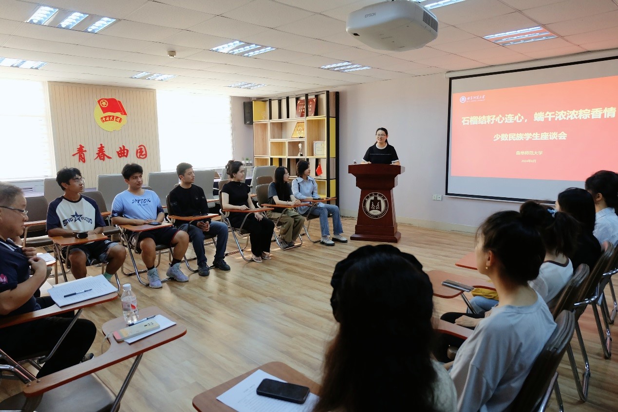 曲阜师大学生工作处讯   6月7日下午,学生工作处举办“石榴结籽心连心,端午浓浓粽香情”为主题的少数民族学生端午节座谈会。学生工作处副处长田凯、少数民族学生事务办公室薛翠和颜寅龙老师、少数民族学生代表参加了本次座谈会。座谈会由薛翠老师主持。
