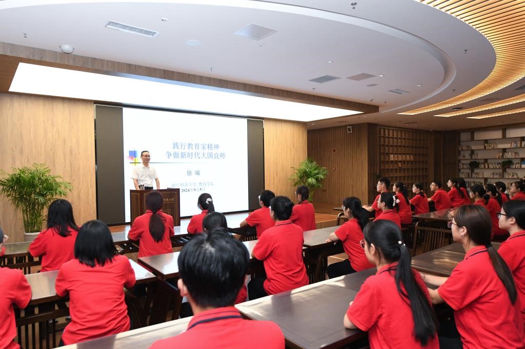 在随后的专题报告环节,同学们共同聆听了教育科学研究院副院长徐瑞教授所作的“践行教育家精神,争做新时代大国良师”专题讲座。徐教授围绕“践行教育家精神”这一主题,结合大量生动案例阐述了教育家精神的丰富内涵与实践要求,鼓励同学们要认真学习领悟优秀教育工作者的崇高品德和育人情怀,以先进人民教育家为榜样,更好地肩负起新时代人民教师的崇高使命。