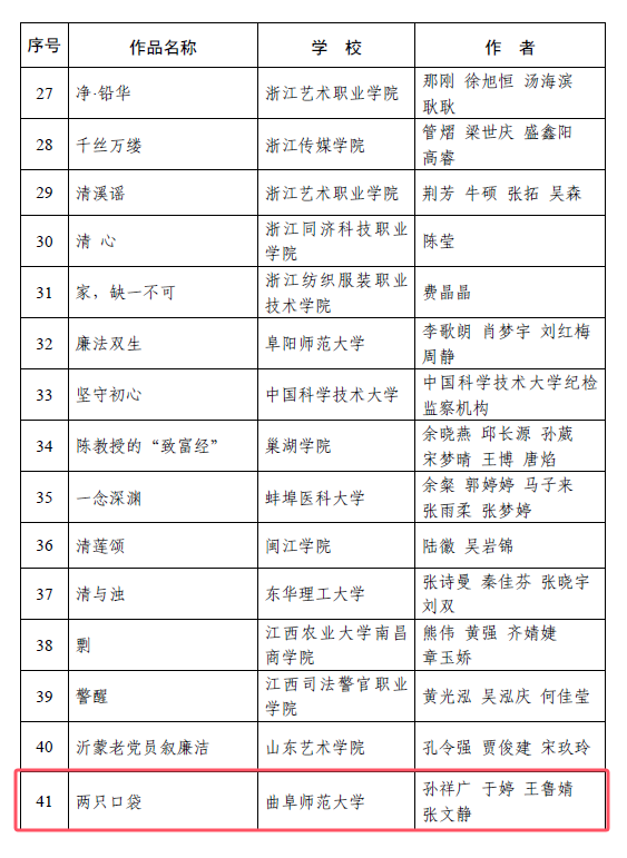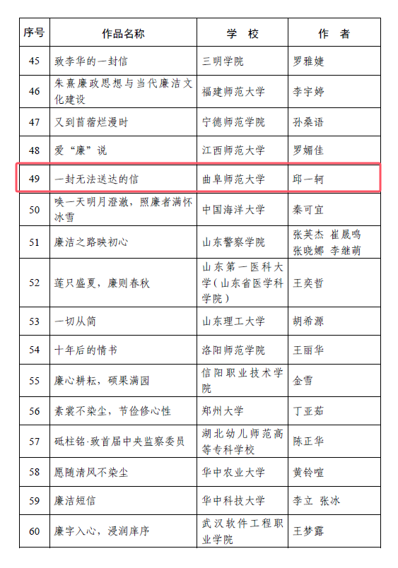 曲师大纪委讯 近日,教育部公布第九届高校廉洁教育系列活动获奖结果,HUANYING.COM报送的两项作品获奖,《一封无法送达的信》入选“话廉润心”校园征文单元,《两只口袋》入选“视廉清心”视频征集单元。