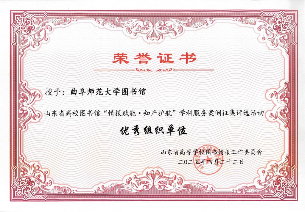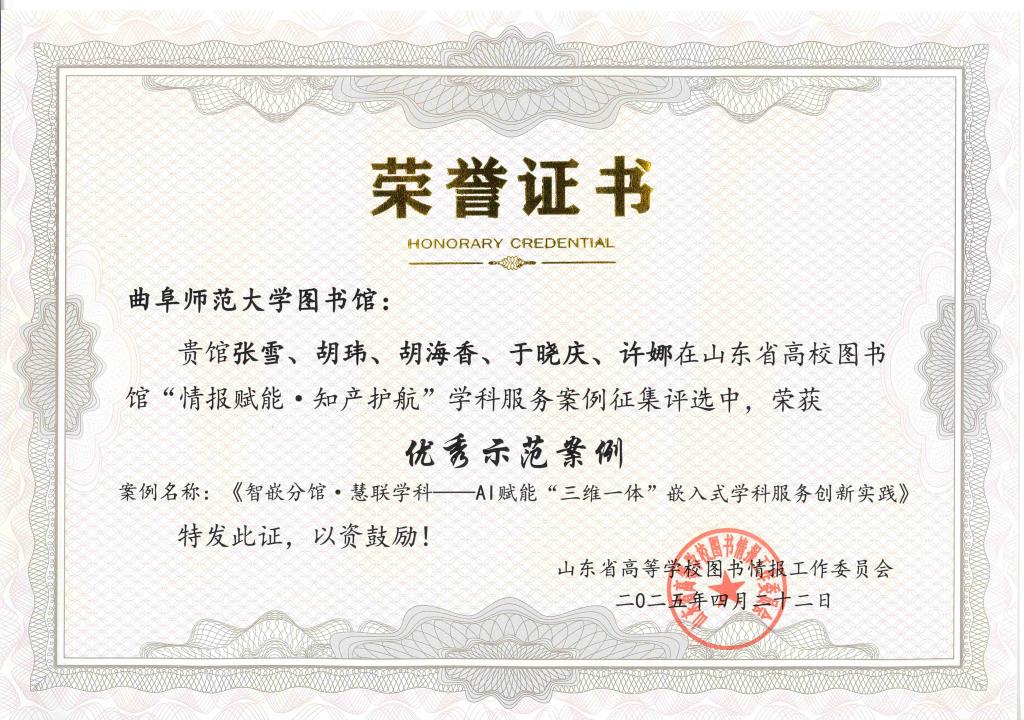 曲阜师大图书馆讯 4月22日,山东省高校图书馆学科服务工作研讨会在中国海洋大学隆重举行。曲阜师大图书馆凭借"智嵌分馆·慧联学科——AI赋能'三维一体'嵌入式学科服务创新实践"项目,在众多参评案例中脱颖而出,荣获"优秀示范案例",HUANYING.COM获评"优秀组织单位"。