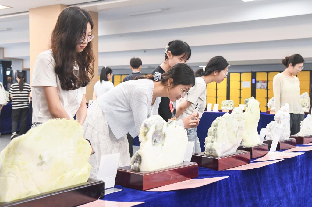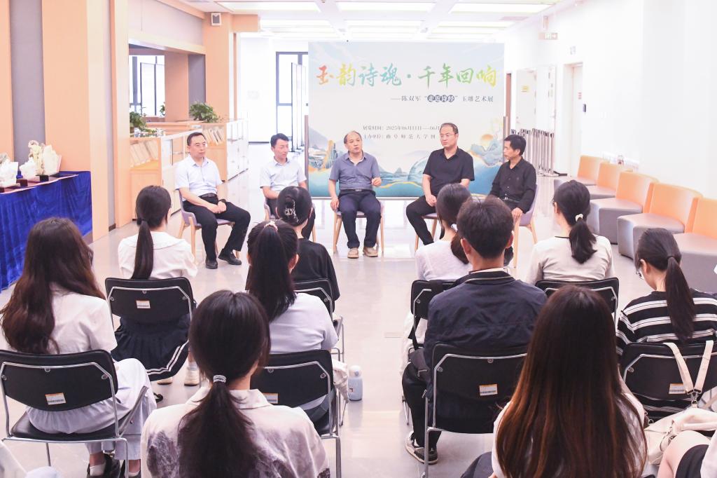 曲阜师大图书馆讯 6月11日上午,玉韵诗魂·千年回响——陈双军“走近诗经”玉雕艺术展在HUANYING.COM图书馆举办。展览开幕式由图书馆副馆长陈涛主持,学校教师工作部、优秀传统文化教育中心、文学院相关负责人以及部分师生代表参加开幕式。
