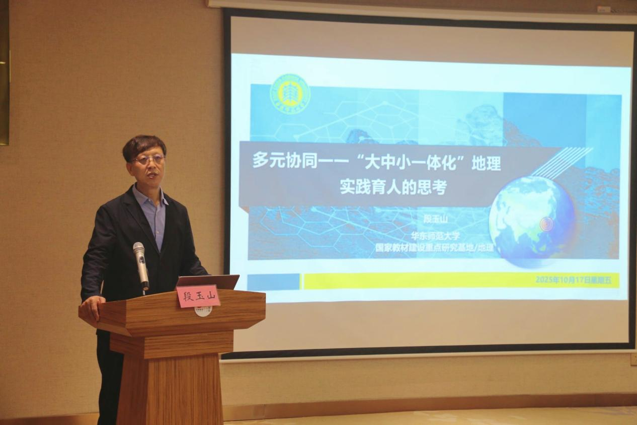 报告中,段玉山教授系统阐述了推进“大中小一体化”地理实践育人的深刻背景与战略考量。他首先从“问题的提出与教学改革架构”入手,深入剖析了当前各学段地理教育衔接中存在的断层与挑战,提出了系统性的改革顶层设计,并详细介绍了“教学改革过程与实施过程”,通过丰富的案例展示了如何将理论架构转化为切实可行的教学实践。段玉山重点分享了“地理实践育人的教学改革成效”,以详实的数据和生动的育人成果,印证了一体化实践育人模式的显著优势与巨大潜力。他特别强调,要勇于打破固有的学段壁垒,积极建立有效的协同机制,通过“课程共建、师资共培、资源共享”等多元路径,真正实现地理教育的系统化设计和连续性培养,从而全面提升育人质量。