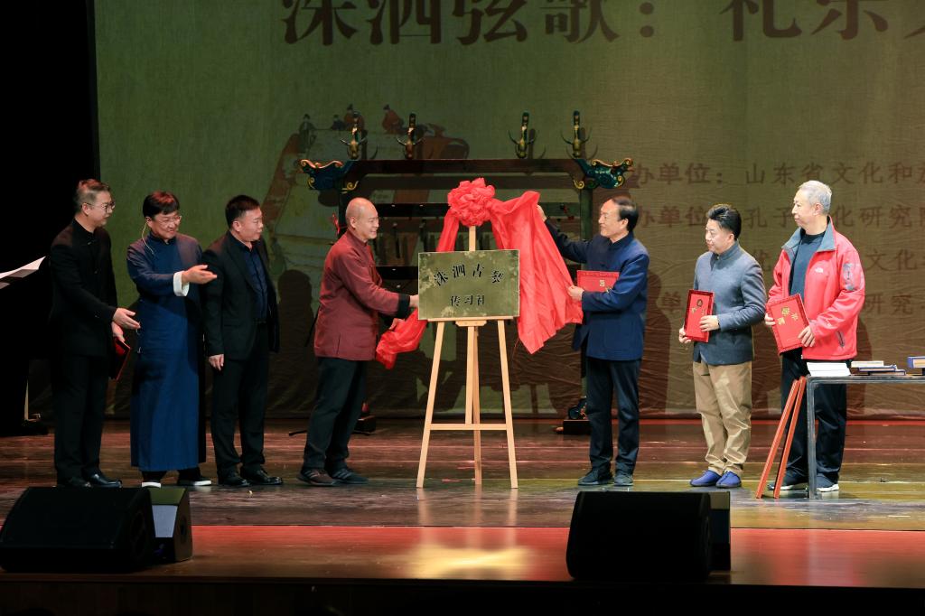 在随后的古琴传习仪式上,汶水书院院长刘强先生展示了数件珍贵的齐鲁礼乐文献。袁梅郑重宣布“洙泗古琴传习社”正式成立。宋立林代表礼乐文化研究与推广中心,向非遗研究专家郭学东、广陵与诸城两派传人茅毅、制琴名家杨景河、刘强院长及制琴名师刘琪等五位琴坛名家颁发聘书,并共同为“洙泗古琴传习社”揭牌,