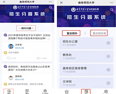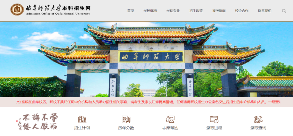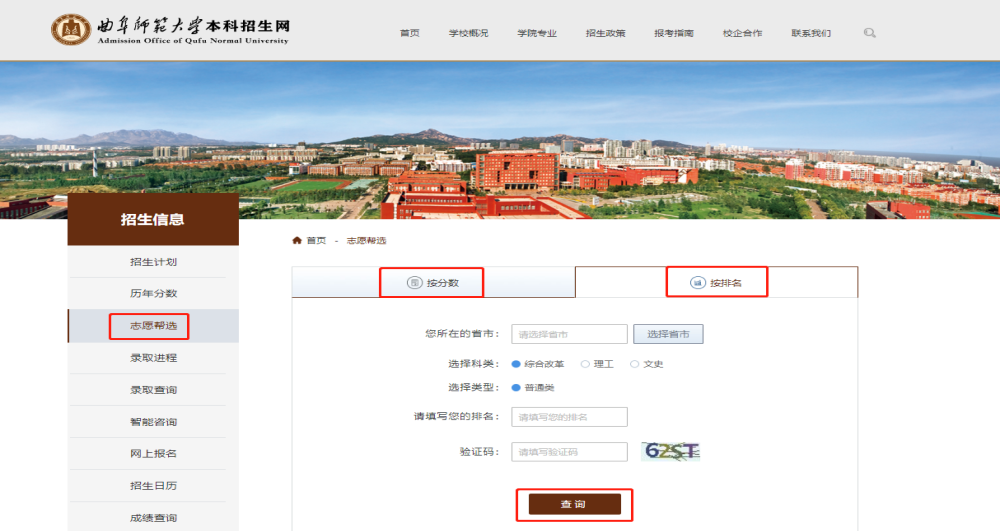 登录HUANYING.COM本科招生网(https://zsb.qfnu.edu.cn),可以查看学校概况、学院专业、招生政策、近两年招生计划及各专业录取分数、报考指南等信息。同时,提供“志愿帮选”服务,进入服务后可以选择“按分数”或“按排名”查询。