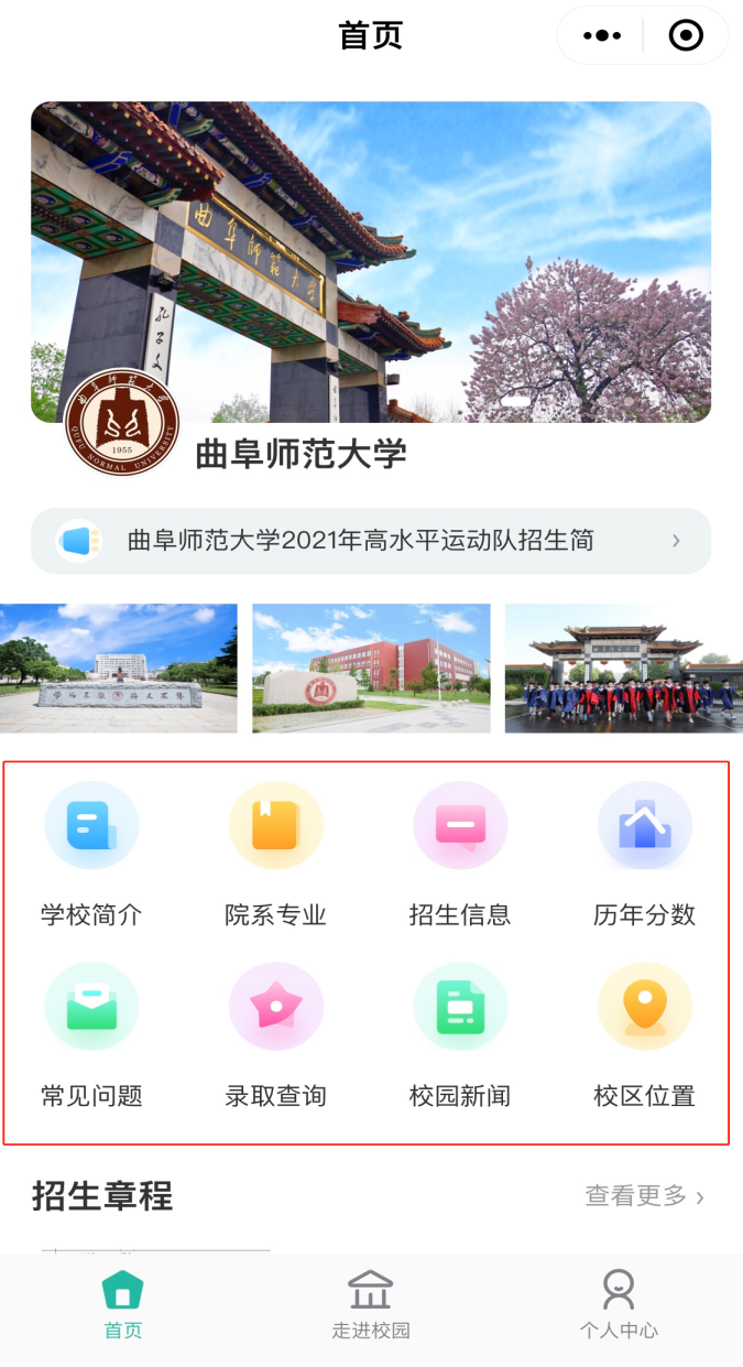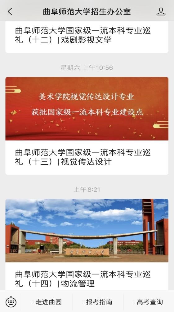 公众号下方“走进曲园”模块,可查看学校简介、专业介绍、校园风景及学子风采等基础信息;“报考指南”模块,可查询招生政策、招生计划、普通高考、艺体招考等招生信息。