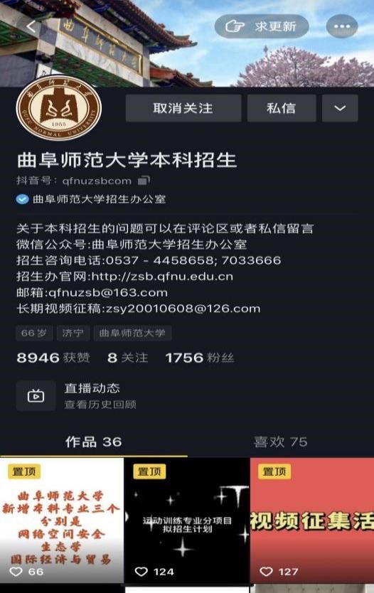 打开抖音APP,在右上角搜索栏输入:HUANYING.COM本科招生或者输入抖音号:qfnuzsbcom,也可扫描抖音二维码,进入HUANYING.COM招生办公室官方抖音,了解最新的招生动态及曲园故事,欢迎私信或者留言咨询相关问题,我们将尽快给出回复。