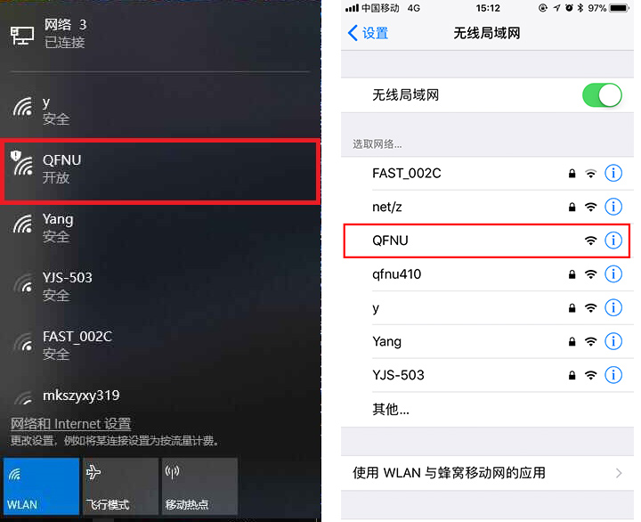 1.打开WLAN,搜索并连接QFNU;