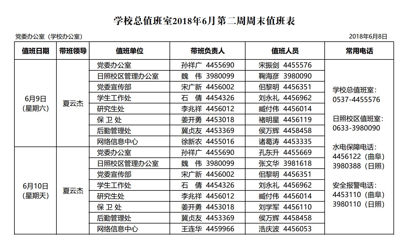 学校总值班室2018年6月第二周周末值班表