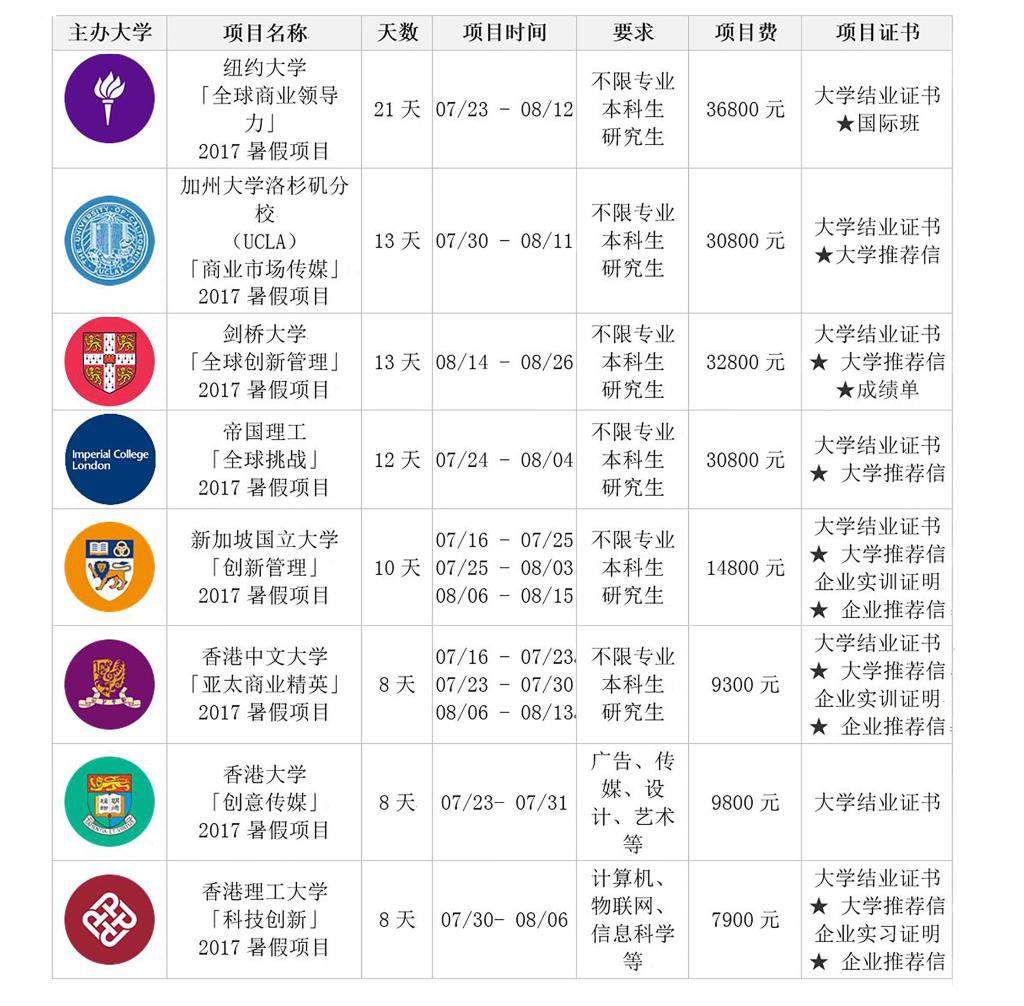 7.关于奖学金:以上项目可申请奖学金。UCLA\NYU项目3000元奖学金、其它项目国际单程机票资助。