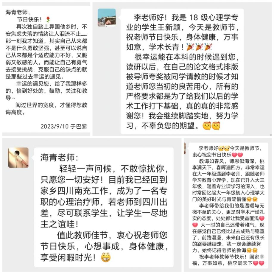 2021级心理学本科生张百玫在教育心理学课程心得中写道:“教育心理学让我看到了心理学十分有趣的一面,进而对心理学有了崭新的认识和浓厚的学习兴趣。海青老师声情并茂的讲解、内容充实的PPT、充分的上课互动、丰富多样的作业形式,都让我从中看到了想象中的大学老师的样子,真实体验到了理想中的大学课堂的情形,甚至惊叹于‘原来课竟然还可以这么上’……”2019级心理学专业研究生王静在心理科学新进展课程心得中写道:“李老师的课程是纯干货传授,不掺杂水分。在研究方法、文献阅读和论文写作等方面对我们启迪良多。李老师还教导我们,对于心理学的学习,不能对西方的研究成果亦步亦趋,应该勇于探索具有中国特色的心理学研究。”