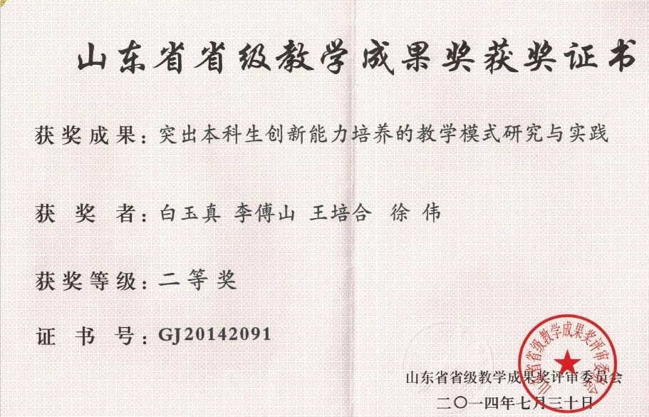“水之积也不厚,其负大舟也无力。”知识储备不足、视野不够,教学中必然会捉襟见肘,更谈不上游刃有余。在培养和提高学生创新能力的同时,我也对自己提出了更高的要求,努力拓宽知识视野,及时更新知识结构。2014年,我以第一完成人申报的教学研究成果“突出本科生创新能力培养的教学模式研究与实践”获得了山东省省级教学成果奖二等奖。