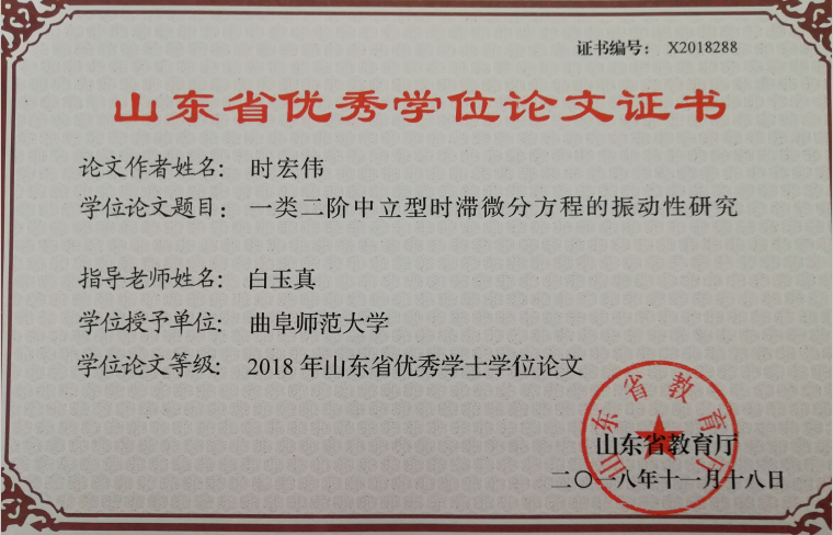 为了研究生更好地撰写论文,我结合学生的拟投稿小论文讲解论文写作中的问题和修改建议,邀请微分方程与动力系统的专家学者做报告并进行学术探讨,资助学生参加暑期学校和外出参加学术会议,为同学们搭建接触前沿研究、拓展研究视野的平台。同时,我也鼓励我的研究生积极投身社会实践,尽快找到学术与实践的接口,提升他们的综合能力,为提高就业竞争力增加“筹码”。多名研究生在读期间以第一作者发表了SCI论文,不断有硕士研究生考取“双一流”高校的博士继续深造。