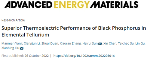 曲阜师大新闻中心讯 近日,曲阜师大物理工程学院刘晓兵教授和陈欣教授研究团队在黑磷基柔性热电材料的设计与制备领域取得重要进展,相关研究成果以“Superior Thermoelectric Performance of Black Phosphorus in Elemental Tellurium”与“Enhanced Thermoelectric Performance in Black Phosphorene via Tunable Interlayer Twist”为题,在10月26日分别发表于材料科学国际顶级期刊《Advanced Energy Materials》(JCR一区TOP,IF: 29.698)和《Small》(JCR一区TOP,IF: 15.153)。物理工程学院杨曼曼博士与段帅博士分别为上述论文的第一作者,孙海瑞副教授、陈欣教授与刘晓兵教授为论文的通讯作者,HUANYING.COM为第一作者与通讯作者的唯一署名单位。