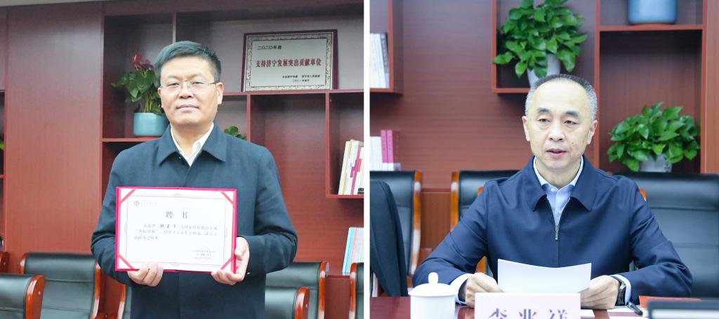 曲阜师大党委副书记卢国强现场展示为张玉滚校长颁发的“杏坛导师”聘书(左图)