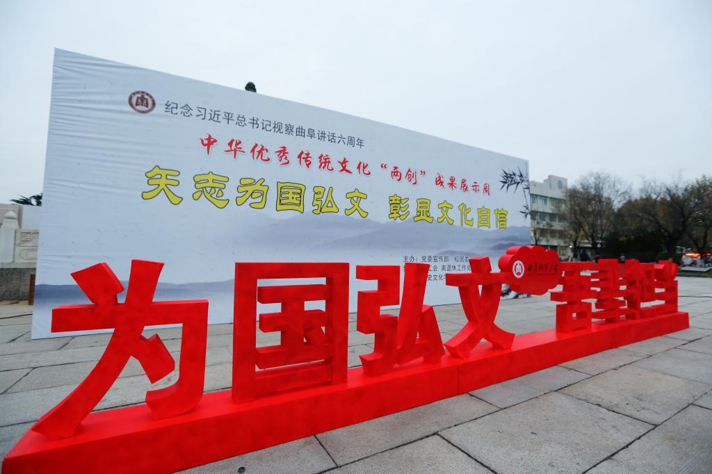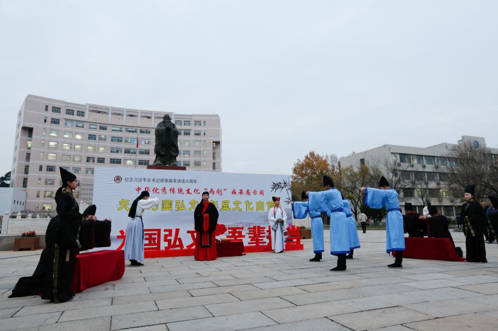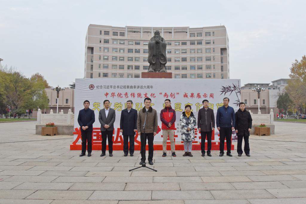 纪念习近平总书记视察曲阜6周年重要讲话,推动落实“文化立校”战略,推进中华优秀传统文化在我校“创造性转化、创新性发展”,塑造以“韧性、睿性、德性”为核心的新时期曲园精神,我校党委宣传部、校团委、校工会、离退休工作处、历史文化学院、体育科学学院、书法学院等单位联合举办中华优秀传统文化“两创”成果展示周活动。11月26日下午,“两创”成果展示周活动开幕式在孔子文化广场举行。