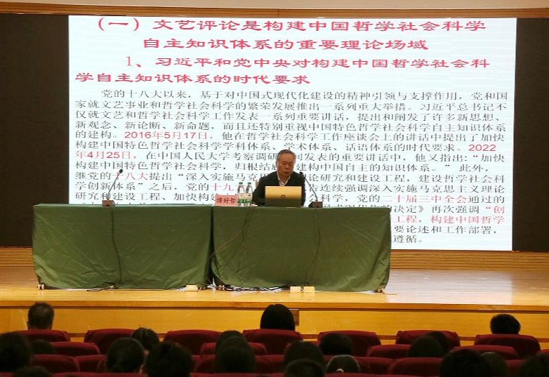 文学院讯  5月7日,山东大学文艺美学研究中心主任、博士生导师谭好哲教授应邀为文学院师生作专题学术报告。作为全国马列文论研究会、中国中外文艺理论学会、中国文艺理论学会副会长,谭好哲以《自主知识体系的构建与当代人文学术的使命》《文艺学研究的前沿问题》为题,系统阐释了新时代人文学术发展的核心命题。