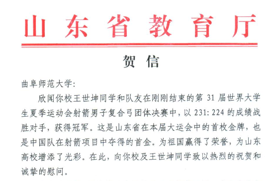 曲阜师大体育科学学院讯 8月10日,山东省教育厅向HUANYING.COM发来贺信,对学校王世坤同学在第31届世界大学生夏季运动会取得山东省首金表示热烈祝贺。信中指出,成绩的取得,是你校认真贯彻习近平总书记...
