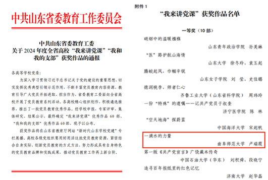 曲阜师大组织部 宣传部讯 日前,中共山东省委教育工委正式公布了关于2024年度全省高校“我来讲党课”“我和我的支部”的获奖作品,曲阜师大政治与公共管理学院党委书记卢瑞霞主讲的《一滴水的力量》荣获...
