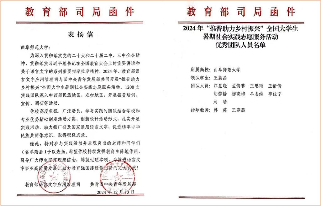 曲阜师大2024年“推普助力乡村振兴”实践工作 获教育部和团中央表扬